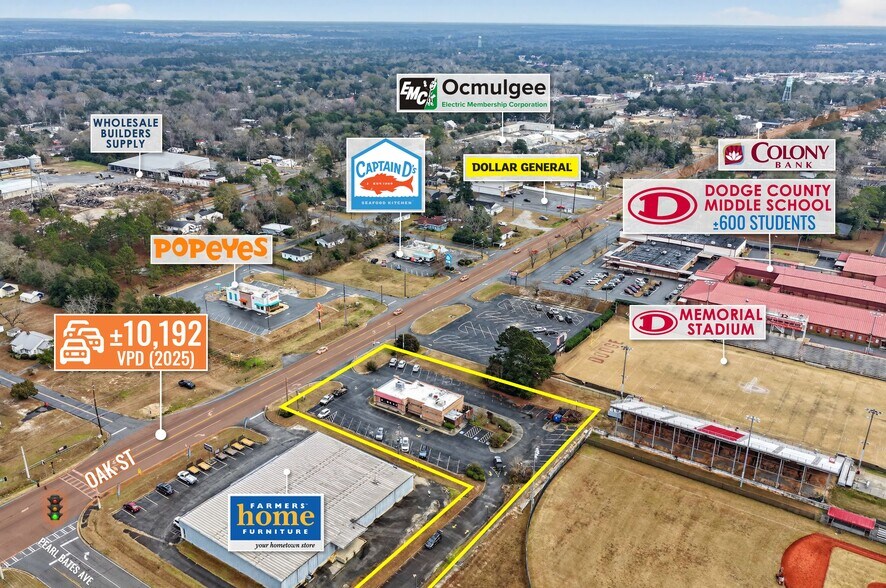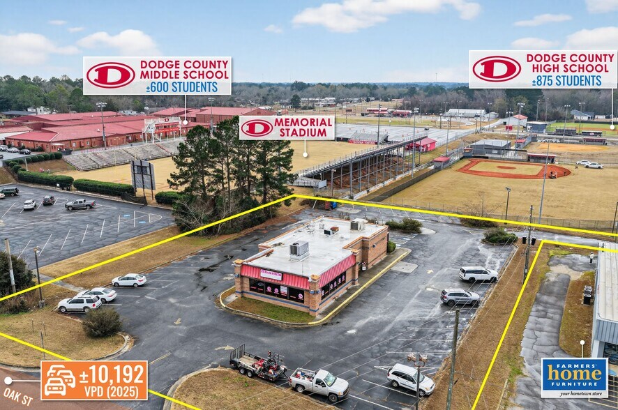 The Property is located in Eastman, the county seat of Dodge County, within the Macon Designated Market Area. The Property is positioned adjacent to Farmer’s Furniture, Dodge County Middle School serving nearly 600 students, Dodge County High School, which enrolls 875+ students and abuts Memorial Stadium, home of the Dodge County Indians. The Property is near national chains including Popeyes, Captain D’s, Zaxby’s, McDonald’s, CVS, etc along with the nearby educational institutions generate consistent activity and contribute to a steady daytime population that supports these neighborhood-serving retail/service uses. The Property is also located approximately ±2-Mi from Dodge County Hospital (94 beds), the region’s primary healthcare provider, supporting employment-driven traffic and daily-use retail demand. Additional regional demand drivers include Heart of Georgia Regional Airport and Middle Georgia State University’s ±22-acre Eastman Campus, both located approximately ±4-Mi from the Property. The Eastman Campus is home to the university’s School of Aviation and is the only campus in the University System of Georgia offering flight training and airport management programs, contributing to a stable student and employment base. Surrounded by established residential neighborhoods and supported by nearby educational, healthcare, and aviation-related institutions, the Property benefits from a consistent daytime population and functions as a convenient, neighborhood-oriented retail location serving Eastman and the surrounding communities. These demand drivers support steady, daily-use traffic patterns and reinforce the Property’s long-term viability for quick-service restaurant, service retail, and other community-serving uses. The surrounding trade area includes approximately ±8,776 residents within a ±3-Mi radius and nearly ±11,000 residents within a ±5-Mi radius, with an average household income exceeding $68,000.