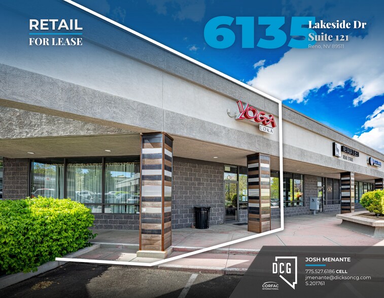 DCG is pleased to present 6135 Lakeside Dr, Suite 121 for lease. This ±1,260 square foot retail suite is located within the well-positioned Shops at Bartley Ranch Shopping Center. The property offers convenient access to South McCarran Boulevard and Interstate 580, placing it in close proximity to a wide range of retail and service amenities. The area benefits from strong visibility and steady traffic, with 2024 NDOT counts reporting approximately 8,000 vehicles per day. Previously occupied by a yoga studio, the space is well-suited for a variety of retail or service-oriented uses.