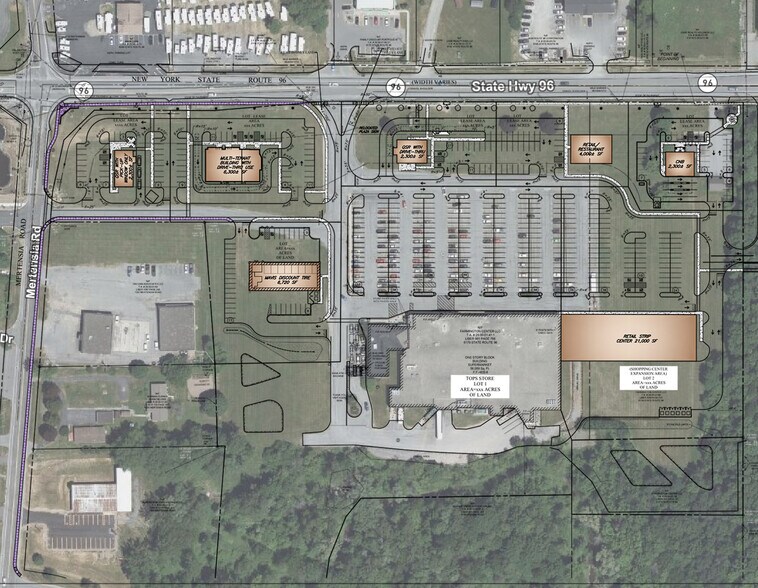 Tops Market a ancré le centre commercial sur la route 96 à Farmington. Les plans d'expansion prévoient la mise en place de plusieurs aires de stationnement pour les utilisations au détail du gaz, des restaurants et des parcelles. Le développement en ligne sera également élaboré. Situé sur la route 96, à environ 1/4 de mille à l'ouest de l'intersection avec la route 332 et à 1 mille de la sortie 44 de New York State Thruway.