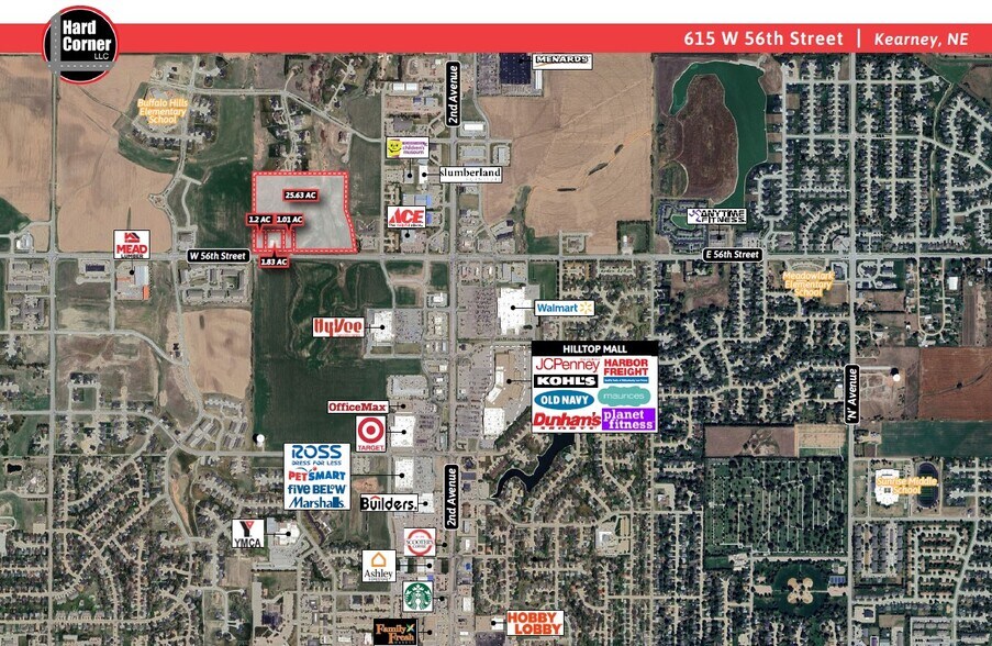 Prime Location - Site is located west of Kearney’s Main Corridor: 2nd Avenue Site is less than 3 miles from Highway 30 (South) and less than 2 miles from Highway 40 (North) Join an excellent mix of national retailers, including: Walmart, Menards, HyVee Grocery, Slumberland Furniture, and Kearney’s Hilltop Mall Direct frontage to W 56th Street/Hwy 10