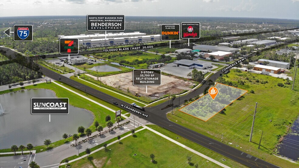 SVN Commercial Partners, à titre d'agent exclusif, est heureux de présenter une possibilité de construction en fonction de la combinaison ou d'un bail foncier de 0,76 acre de terrain commercial situé sur le boulevard Cranberry situé à North Port, en Floride. La propriété en cause est entourée d'un énorme potentiel de croissance avec une multitude d'aménagements en cours sur Toledo Blade, Commerce Pkwy et les régions avoisinantes. Le sud-ouest de la Floride offre une combinaison de style de vie, d'abordabilité et de possibilités qui attire des gens de partout au pays. Il existe plusieurs raisons convaincantes pour lesquelles un détaillant voudrait être près de Toledo Blade à North Port, en Floride, près de la sortie 179 de l'échangeur I-75 : Haute visibilité et accessibilité : Le fait d'être situé près de l'échangeur d'une importante autoroute comme l'autoroute I-75 offre une excellente visibilité et un accès facile pour les résidents locaux et les voyageurs de passage. Cette grande visibilité peut attirer des clients potentiels et accroître la circulation pédestre vers l'emplacement du détaillant. Prime Real Estate Market : North Port, en Floride, est identifié comme l'un des endroits les plus populaires où déménager, ce qui indique une population croissante et un marché immobilier robuste. Le fait d'être présent dans une région aussi florissante peut offrir au détaillant de nombreuses possibilités d'expansion de sa clientèle et d'accroître son potentiel de vente. Aménagement adapté : La disponibilité d'une propriété de 0,76 acre pour un aménagement adapté aux besoins est très attrayante pour les détaillants. Cela permet au détaillant d'adapter l'espace à ses besoins particuliers, assurant ainsi une mise en page efficace et fonctionnelle qui optimise l'expérience client. Proximité des zones résidentielles : L'emplacement de la propriété près de Toledo Blade la place à proximité des quartiers résidentiels. Cette commodité pourrait faire du détaillant un choix incontournable pour les résidents de la région pour répondre aux besoins de leurs consommateurs, ce qui favoriserait la fidélité de la clientèle. Perspectives économiques positives : La région connaît des perspectives économiques positives avec une forte croissance de l'emploi et des revenus médians croissants, ce qui indique une clientèle financièrement stable et un plus grand pouvoir d'achat, ce qui peut être avantageux pour le détaillant. Administration locale de soutien : Un détaillant qui cherche à établir une présence à North Port peut bénéficier d'un gouvernement local favorable aux affaires qui offre des incitatifs ou des processus simplifiés aux nouvelles entreprises, ce qui rend le processus d'expansion plus fluide et potentiellement plus rentable. Potentiel de croissance à long terme : L'établissement d'une empreinte dans une région en croissance rapide comme North Port offre au détaillant un potentiel de croissance et de durabilité à long terme, surtout s'il peut obtenir un emplacement de choix et établir une forte présence de marque. Grâce à son emplacement privilégié à proximité de Toledo Blade, cette propriété offre un accès facile aux principales autoroutes dans un marché immobilier en croissance rapide, ce qui en fait un excellent emplacement pour ceux qui recherchent une occasion de construction pour prendre de l'expansion et tirer parti de la clientèle croissante.