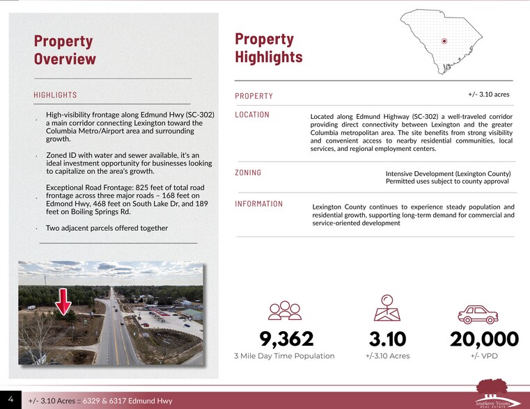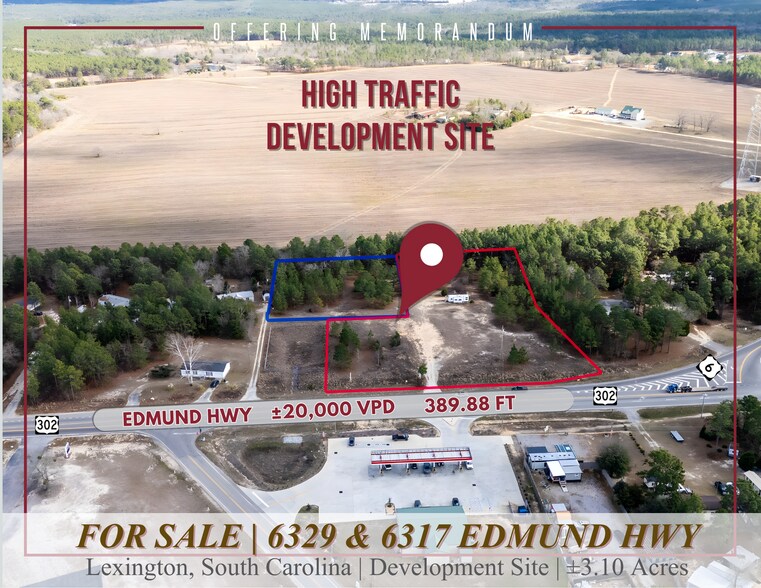 Two adjacent vacant land parcels totaling approximately ±3.10 acres located along Edmund Highway (SC-302) in Lexington, South Carolina. The property offers strong frontage and visibility along a well-traveled corridor serving Lexington County and the greater Columbia metropolitan area. Suitable for a range of commercial or investment uses, subject to zoning, approvals, and buyer due diligence.