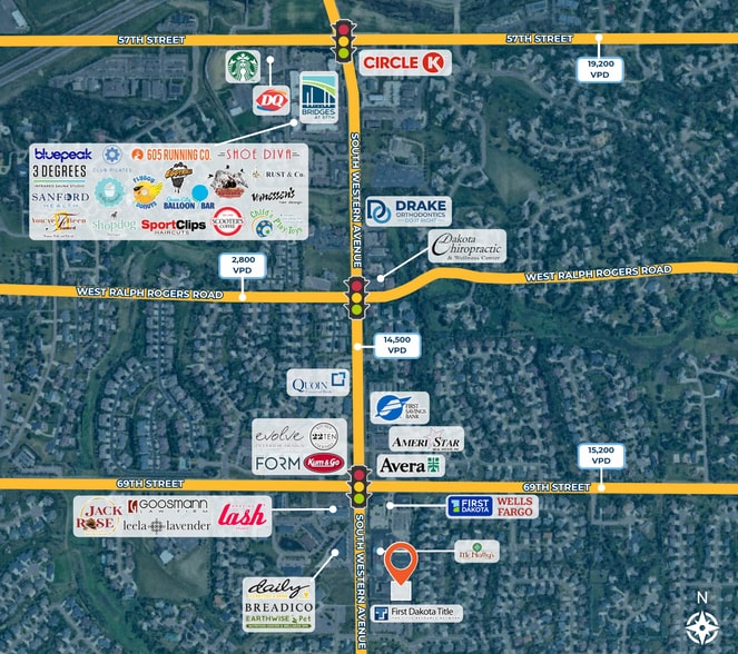 Heather Ridge Office Park is located just south of 69th Street on the corner of South Western Avenue and West La Quinta Street. Convenient access to restaurants and retail, ample parking, and visibility make this office park desirable to professional office users. Area Tenants: First Dakota Title, Wells Fargo Advisor, St. Croix Hospice, McNally’s Irish Pub, Charlie’s Pizza, Daily Clean Food & Drink, 22Ten Kitchen & Cocktails, The Bridges at 57th Street