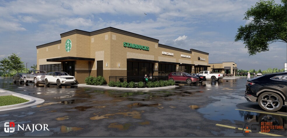 New Development on the hard corner of Highland Road and Bogie Lake Road in White Lake Township anchored by Starbucks Coffee.