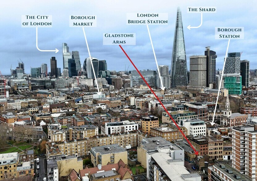 Located in within the London Borough of Southwark, 1.0 mile (1.6 kilometres) east of Waterloo and 1.8 miles (2.9 kilometres) south east of Central London. The Gladstone Arms is situated on Lant Street in a predominantly residential area and is located a short walk from Borough Underground Station which provides London Underground services via the Northern Line giving fast travel to the City of London (Bank Station) in approximately 5 minutes. Borough Market is located just 0.4 miles to the north of the property.