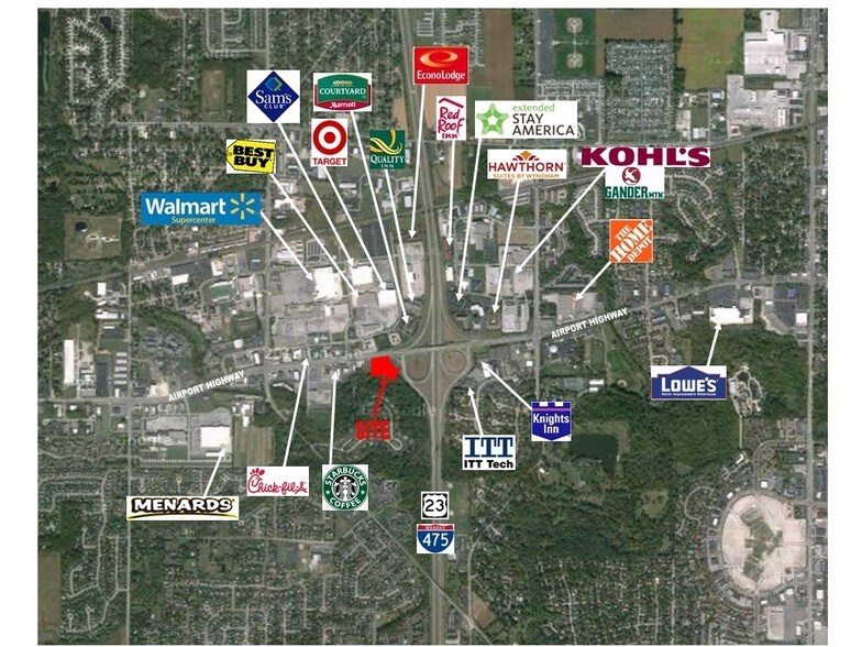 Terrain commercial privilégié avec exposition extrodinaire sur la route le long de la route I-475 et US-23. Situé en face de Target, Walmart Supercenter, Sam's Club, Dick's Sporting Goods et de nombreux restaurants nationaux. 4,0 acres (2,0 acres pouvant être construites) pour les utilisateurs de commerces de détail, de restaurants, d'hôtels ou de bureaux.