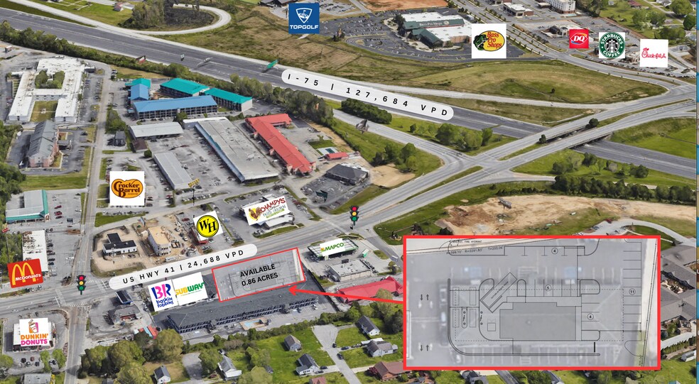 Oliver Smith Realty and Development Company est heureuse de présenter une excellente possibilité de bail foncier directement à côté de la bretelle de la sortie 1 de l'I-75 du côté sud. Ce terrain prêt à l'emploi sera situé directement en face de l'hôtel Stay Express Inn existant. À l'heure actuelle, vous verrez deux (2) bâtiments sur le site, l'un est un plus petit bâtiment à l'avant faisant face au chemin Ringgold qui sera démoli pour faire place à la zone de 0,86 acre. Pour obtenir des conseils sur les prix sur ce site, veuillez communiquer avec Brian Coyle au 203-918-3944, nous pouvons louer au sol ou faire une construction sur mesure. Il s'agit d'une occasion unique pour les restaurants QSR ou les utilisateurs de locataires nationaux en raison de l'actuelle Loi sur le développement du tourisme de détail dans les régions frontalières. Essentiellement, la ville a incité les promoteurs et les exploitants à se situer sur la ligne TN, au lieu de la ligne de l'État de Géorgie pour maintenir les recettes de la taxe de vente au Tennessee. Cet incitatif, tel que nous le comprenons, offrirait une partie du pourcentage de la taxe de vente brute pour obtenir un remboursement pour aider à compenser les dépenses d'un promoteur ou d'une entreprise. Essentiellement, l'incitatif aiderait à alléger une partie du coût du loyer. Nous pouvons vous aider à vous mettre en contact avec les responsables municipaux appropriés qui peuvent expliquer cela plus en détail, et des informations peuvent également être trouvées sur le site Web de la ville d'East Ridge, TN. Notre site en question offre une façade routière phénoménale, à environ 250 pieds face au chemin Ringgold, et une grande visibilité entre les États. Nous pouvons assurer un grand stationnement sur place, mais aussi offrir des servitudes d'accès croisé par l'hôtel à l'arrière pour accéder à des places de stationnement supplémentaires si nécessaire. L'accès croisé permettra également aux clients d'accéder à ce site à l'intersection du chemin Ringgold et du chemin S Mack. Un trottoir d'entrée arrière coupé sur le chemin S Mack mène à l'hôtel.