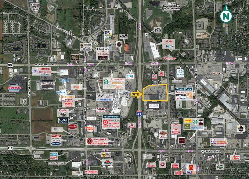 • Positionné le long du boulevard Westhill (11 400 VPD) avec 2 points d'accès et un panneau de monument à l'angle du boulevard Westhill et de l'avenue Wisconsin (25 300 VPD) et un autre monument le long de la I-41 • Situé dans la zone commerciale d'Appleton, qui comprend 3,6 millions de pieds carrés d'espace de vente au détail et est ancré par le Fox River Mall, un centre commercial régional de 1,2 M de pieds carrés comprenant Target, Macy's et JCPenney • Données démographiques souhaitables sur les zones de commerce, dont la valeur médiane des maisons est d'environ 272 561$ et le revenu moyen des ménages de plus de 96 000$ dans un rayon de 5 milles • 579 places de stationnement • Recherche : détaillants, fournisseurs de soins médicaux, clubs de santé, utilisateurs de meubles et éventuellement automobile