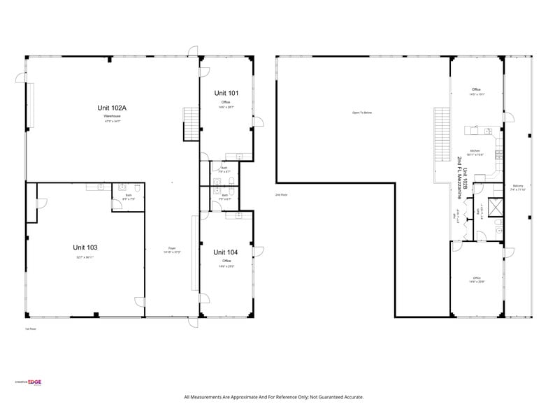 3 UNITS AVAILABLE Unit 101 Unit Size 426 SF Sale Type: Rental Condo Use Flex Parking: Adjacent Lot DESCRIPTION Fully finished ground floor unit with one finished office, a kitchenette and bathroom. Flooring is stained concrete. RENTAL NOTES This unit can be rented at $22/SF separately or can be combined with Units 102 and 104 for a reduced price of $18.50/SF. Unit 102 Unit Size 2,750 SF Sale Type: Rental Condo Use: Flex, Parking: Adjacent Lot DESCRIPTION Fully finished unit has ground-floor warehouse with two 12’ rollup door and 20’ interior clearance with mezzanine containing finished office, full kitchen, dining or meeting room, bathroom with shower and west-facing balcony. Flooring is stained concrete. Unit can be leased separately or combined with adjacent unit(s) to create a larger space. RENTAL NOTES This unit can be rented at $22/SF separately or can be combined with Units 101 and 104 for a reduced price of $18.50/SF. Unit 104 Unit Size 426 SF Sale Type: Rental Condo Use: Flex Parking: Adjacent Lot DESCRIPTION Fully finished ground floor unit with one finished office, a kitchenette and bathroom. Flooring is concrete. RENTAL NOTES This unit can be rented at $22/SF separately or can be combined with Units 101 and 102 for a reduced price of $18.50/SF.