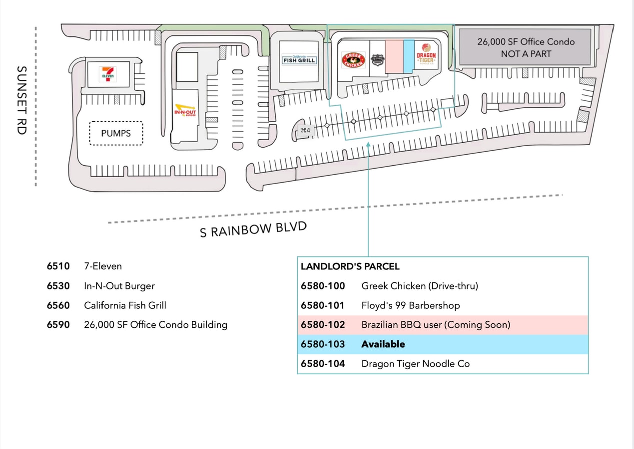 Centre proéminent dans le sud-ouest, situé sur Rainbow juste à côté de la 215. Deux espaces en ligne disponibles avec cuisine/cuisine partielle. Situé dans le centre Rainbow Commons où les locataires comprennent : In-N-Out Burger, 7-Eleven, California Fish Grill, Dragon Tiger Noodle Company et 26 000 SF Office Condo.