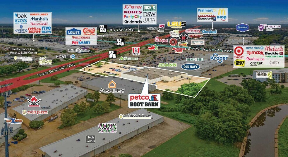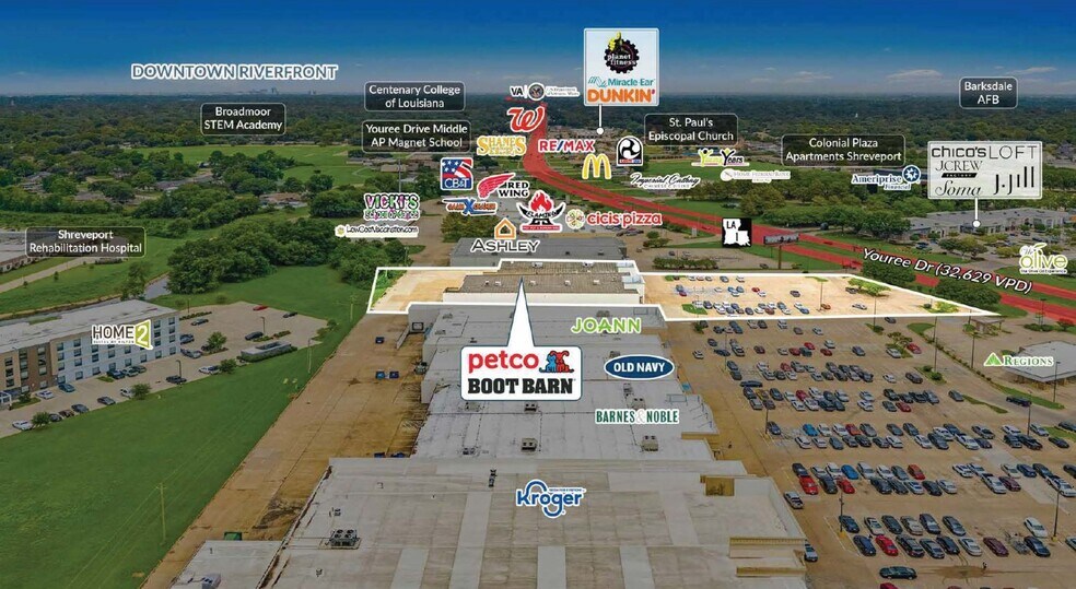 Sands Investment Group est heureux de présenter en exclusivité à la vente la propriété de deux locataires Petco & Boot Barn, située dans le très prisé centre commercial Bayou Walk, à l'intersection de Youree Drive et E 70th Street à Shreveport, LA. Le centre commercial Bayou Walk dispose d'un emplacement privilégié avec des détaillants adjacents tels que Kroger, Barnes & Noble, Old Navy, JoAnn Fabric et plus encore. Boot Barn et Petco ont récemment exercé leurs options tôt, démontrant leur confiance dans l'emplacement. Avec 5,5 ans et plus restants pour chaque locataire et de fortes augmentations de loyer à chaque période d'option, cet actif offre à l'investisseur un investissement stable avec une croissance locative attrayante à l'avenir. Offert à un taux de plafonnement de 7,50 % avec de faibles taux de location existants, il s'agit d'une occasion rare d'acquérir un investissement à rendement élevé à faible coût par pied carré.