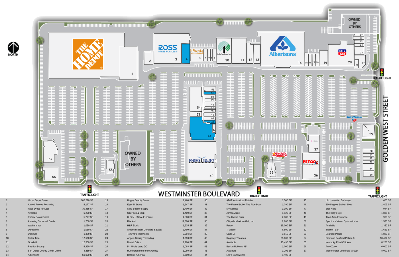Ce centre se classe parmi les projets d'épicerie les plus rentables du comté d'Orange et est un centre de puissance dominant avec de grands détaillants, dont Ross Dress For Less, Albertson's, The Home Depot, Regency Theatres, Petco, Rite Aid, 24 Hour Fitness et Dollar Tree. COMPTES DE LA CIRCULATION - boulevard Westminster et rue Goldenwest - 72 050