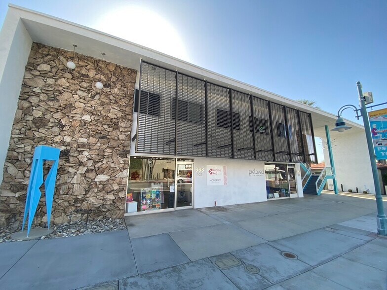 Prime 100% Leased Investment Opportunity in the Heart of Palm Springs' Historic Uptown District. Located in one of Palm Springs' most desirable corridors, this impeccably maintained property offers exceptional visibility and charm. Dual Architecture, Mid Century Modern and Spanish, situated on a single tax lot with two distinct addresses. The offering includes: 668 Building - A striking Mid-Century Modern commercial space ideal for retail, office, or mixed use. 664 Building - A beautifully preserved Spanish-style property, home to the renowned and successful Jake's Restaurant boasting high foot traffic and excellent street frontage. In 2024 Jakes expanded its operation and a new fully renovated lobby, additional indoor seating, kitchen and restrooms. Off-street parking exclusively for tenants. This property is both functional and aesthetically unique. The 668 building features two common area restrooms on the second floor, while the ground-floor retail units each have private restrooms. Additional highlights include a fully paid solar system on the 668 building—enhancing sustainability and reducing operational costs. Currently under application for the Mills Act for a potentially significant property tax reduction. Fully occupied, please do not disturb tenants. Seller open to an exchange for an out of state Commercial property, Hotel or residential income property. Oregon preferred.