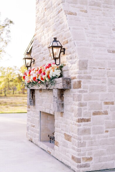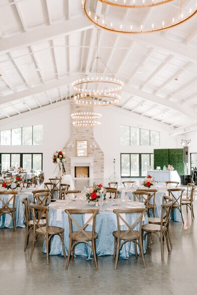 The interior features a full-service kitchen, wet bar, and an impressive floor-to-ceiling stone mantel that serves as a dramatic focal point for gatherings. Thoughtful layout includes a private bridal suite and groom suite, each with their own half bath, providing both comfort and privacy for clients on their special day.