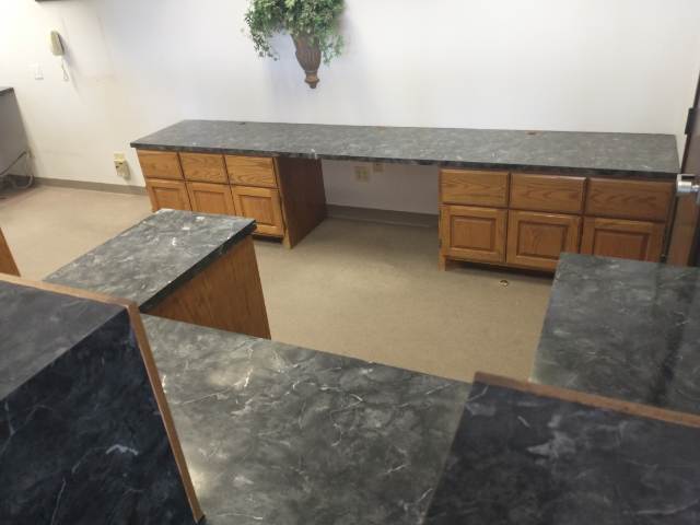 3 Bureaux, salle d'attente et réception, guichet avec coffre, toilettes ADA, salle de repos avec concierge avec lavabo.