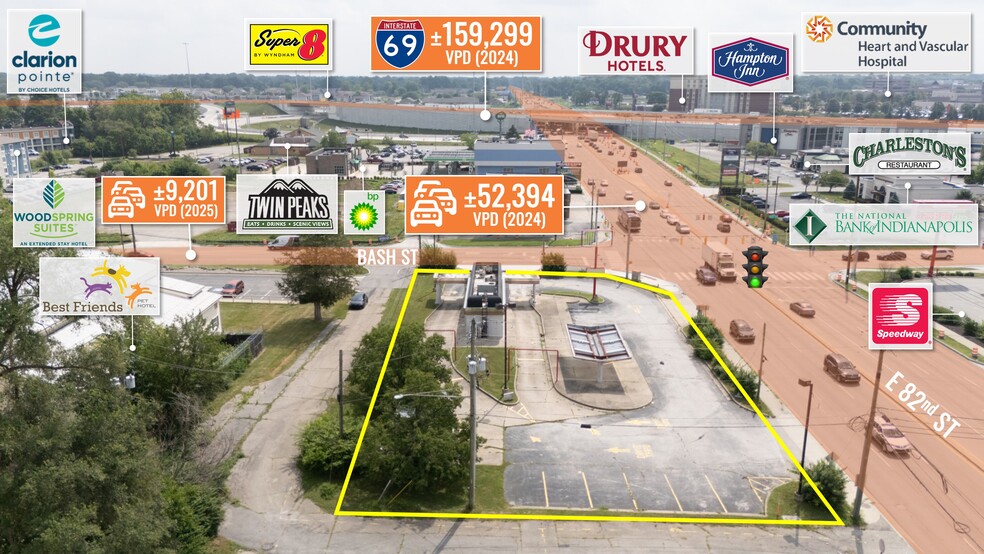 - Signalized Hard Corner with 52K VPD Traffic Counts on E 82nd St and 9K VPD on Bash St | 0.5-Mi from I-69 (159K VPD) | 3-Min from Castleton Sq. Mall