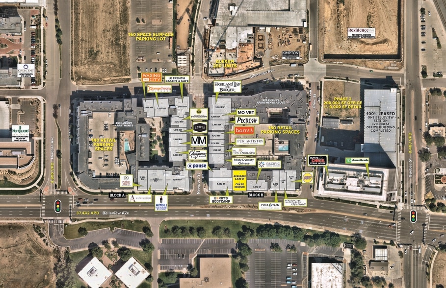 PROJET DYNAMIQUE À USAGE MIXTE AVEC 831 LOGEMENTS 839 UNITÉS SUPPLÉMENTAIRES 4 HÔTELS-BOUTIQUES (370 CHAMBRES) 770 000 PI2 DE LOCAUX À BUREAUX OCCUPÉS ACCÈS IMMÉDIAT À L'I-25 À BELLEVIEW LES ACTIVITÉS COMMUNAUTAIRES RÉGULIÈRES COMPRENNENT LE MARCHÉ FERMIER DE FIN DE SEMAINE ET LE BIG WONDERFUL LES ATTRACTIONS DE VENTE AU DÉTAIL ET DE RESTAURATION COMPRENNENT A-LINE BOUTIQUE, AMBLI, BACK COUNTRY DELICATESSEN, LOS CHINGONES, URBAN EGG, LE FRENCH, TAP & BURGER ET COVUS COFFEE