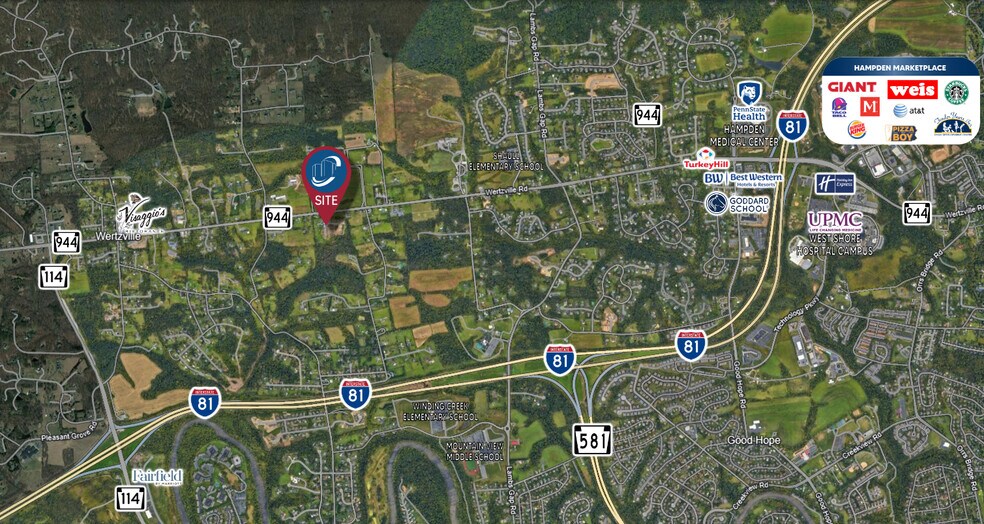 Grand site de développement de +/- 17,51 acres sur le chemin Wertzville (PA-944) dans le canton de Silver Springs, comté de Cumberland, Pennsylvanie. Le site très visible a une façade et un accès au chemin Wertzville et au chemin Beard. Le zonage actuel permet une variété d'utilisations, y compris l'occasion de logement en chalet pour aînés (ECHO) agricole, le développement résidentiel unifamilial, les centres équestres, les gîtes ruraux, les clubs privés et plus encore. L'emplacement se trouve à proximité du campus médical Penn State Health Hampden, du campus de l'hôpital UPMC West Shore, du Hampden Marketplace (Giant Foods, Weis Markets, Starbucks, Taco Bell et Burger King). Situé sur le PA-944 juste à côté de l'I-81 et du PA-114 avec un accès facile à l'autoroute US-15, US-11, I-83, I-76 PA.