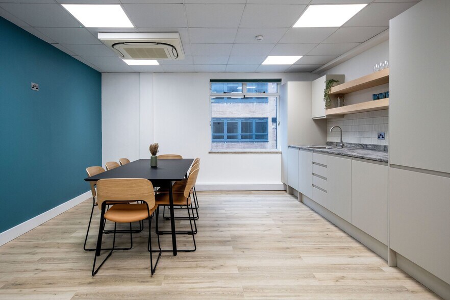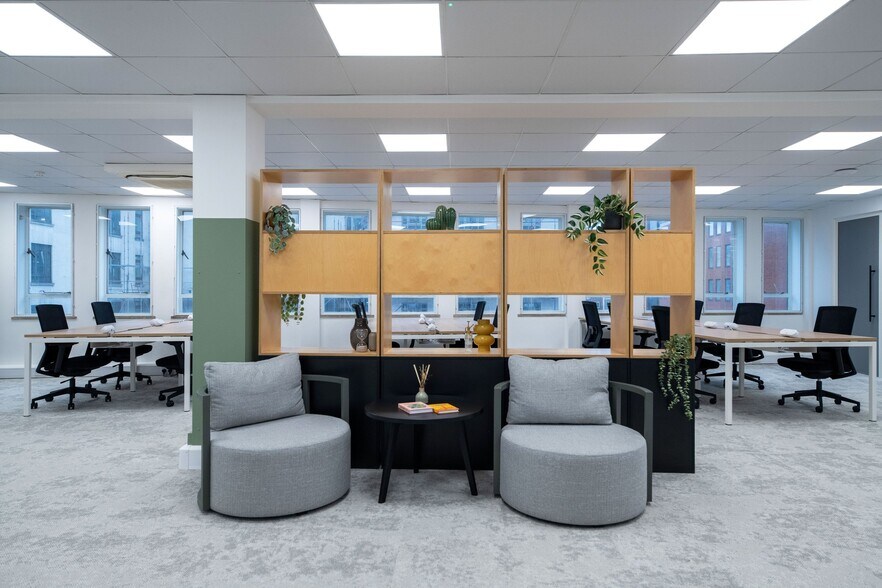 A fully fitted, flexible workspace designed to accommodate a wide range of occupiers. Floors are open-plan with excellent natural light, wooden flooring, modern lighting and the ability to tailor layouts to suit team size and workflow requirements. Occupiers benefit from meeting rooms, breakout areas, a fitted kitchen, lift access, 24-hour entry, air conditioning, bike storage, car parking, and access to the building’s impressive roof terrace.