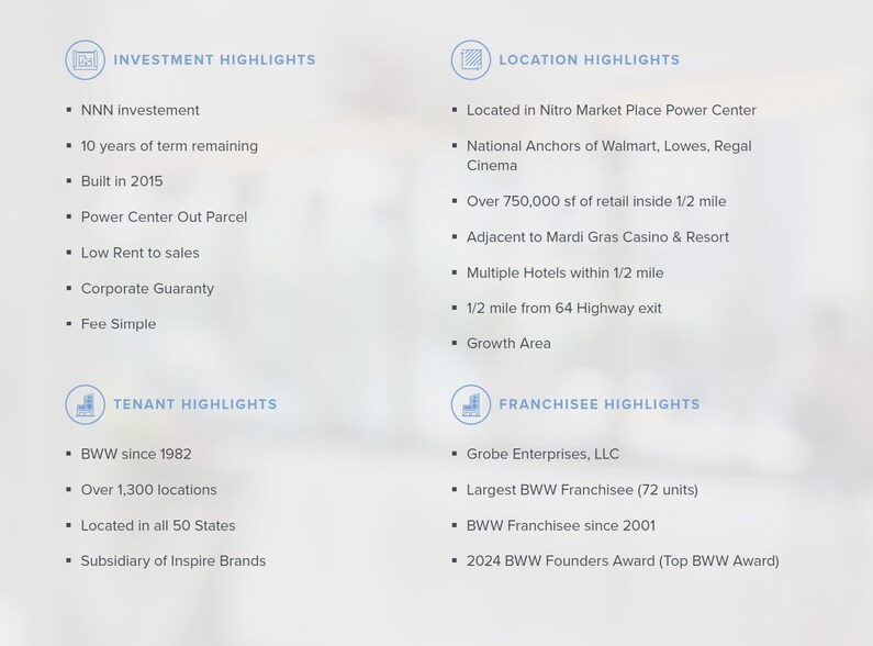 Introducing a rare Charleston, West Virginia MSA single tenant NNN Buffalo Wild Wings investment opportunity at the Nitro Market Place power center in the city of Cross Lanes. The center is ½ mile from the 64 highway exit and consists of over 750,000 sf of retail with National anchors of Walmart, Lowe's, and Regal Cinemas. In the immediate surrounding area around the center are four hotels and the Mardi Gras Casino & Resort. Cross Lanes has experienced growth with a 10-year low in vacancy. A Corporate guarantee backs the Lease, and this franchisee was awarded Operator of the Year in 2024. We are available to answer any questions or pre-offer discussions.