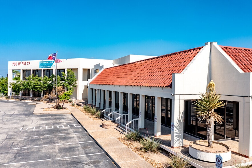Ancien édifice bancaire à l'angle du FM 78 et de Buffalo Place. Très bien situé avec tout à proximité. Situé directement en face du nouveau restaurant Noli's Vite et promenade On the Grind à travers un kiosque à café dans le stationnement. Immeuble de style espagnol de 2 étages avec extérieur en stuc et toit en tuiles d'argile, entrée avant couverte accueille vos employés et clients dans un hall d'entrée en mosaïque, plein de lumière naturelle. Élévateur et escalier menant au deuxième étage, avec un ensemble de toilettes communes à chaque étage. Kitchenette commune locataire au 2e étage. Entrée au clavier après les heures de bureau, caméras de sécurité et beaucoup de stationnement ! Apportez votre entreprise à Buffalo Place !