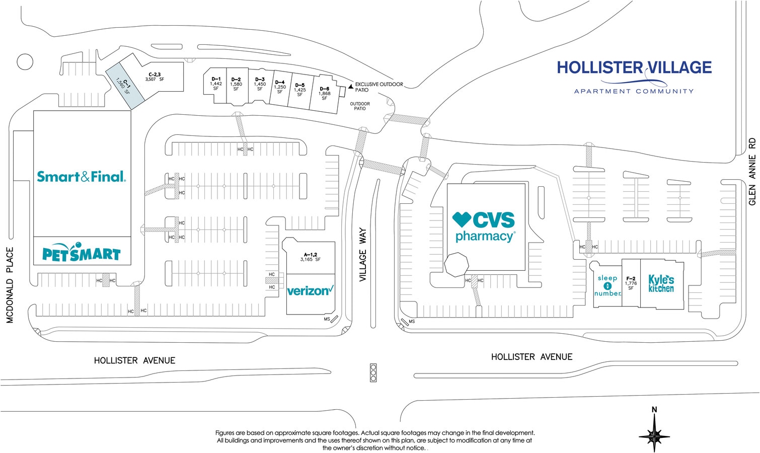 Hollister Village Plaza est un centre commercial de 75 000 pi2 situé à l'intersection de l'avenue Hollister et du chemin Glen Annie. Il est adjacent au Hollister Village Apartment Community, un tout nouveau complexe d'appartements composé de 293 appartements. Le centre commercial offre un accès rapide à l'autoroute 101 à la sortie Glen Annie Road. Il est ancré par Smart & Final Extra et CVS/Pharmacy Drive-Thu et contient une variété de restaurants, de services et de magasins de détail.