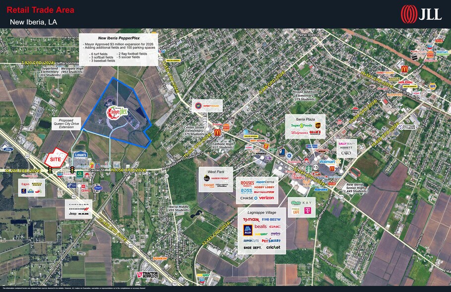 - JLL and JRE are pleased to offer this planned 110,000+ SF retail development in New Iberia for pre-lease. - Anchor and junior anchor boxes available with flexible sizing. - Adjacent to PepperPlex Sports Complex with an approved $3 million expansion planned for 2026. - Situated adjacent to Lowe’s, Waffle House, and LaQuinta in a retail-dense corridor. - Significant frontage to 44,920 cars per day along US-90 and Hwy 14, the area's main thoroughfares connecting New Iberia to Lafayette and surrounding cities. - Outparcels for BTS or Ground Lease.