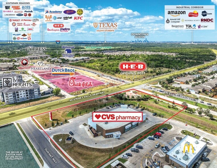 - Large 3.15-acre lot on the hard corner of the signalized intersection of E William Cannon Drive and McKinney Falls Parkway