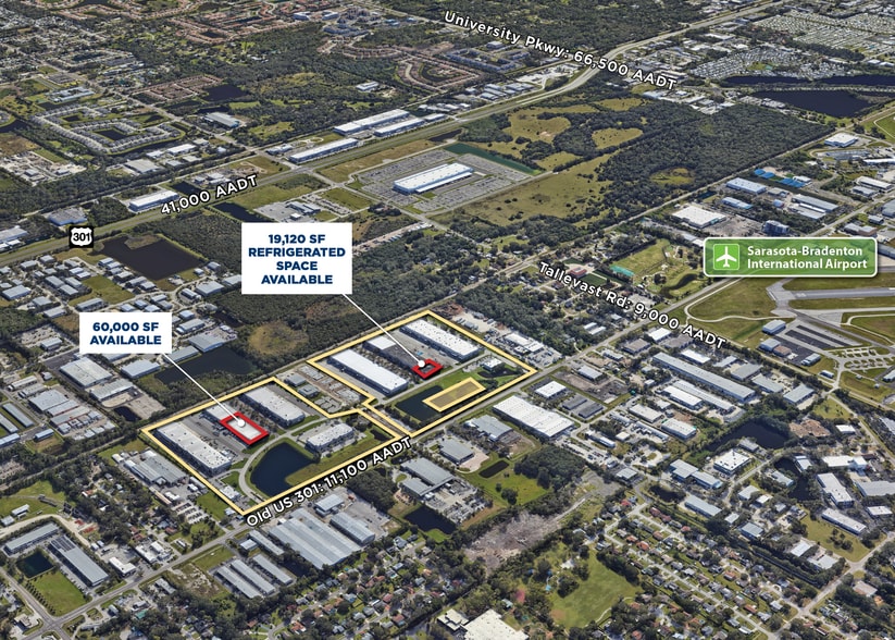 Sarasota-Bradenton Commerce Center est une communauté de travail de style campus avec neuf bâtiments et 687 000 pieds carrés d'espace idéal pour l'industrie légère, la distribution, l'entreposage et la fabrication. Idéalement située sur la 15e rue Est (Old US 301), juste au nord de l'aéroport international Sarasota-Bradenton, la propriété offre un accès facile à l'aéroport, US 301, US 41, I-75 via University Parkway. Les caractéristiques comprennent la construction d'un mur inclinable ; de larges aires de trafic pour camions et un grand espacement entre les bâtiments pour un excellent accès aux camions et aux véhicules ; des hauteurs claires de 24 pi et un grand espacement des colonnes pour une flexibilité intérieure maximale ; des services de télécommunication avancés pour la connectivité vocale, de données et de vidéo ; un système de gicleurs à haute baie ; et une alimentation triphasée de 480 volts. Suites configurées pour répondre à vos besoins, y compris un espace d'entrepôt climatisé et des suites de bureau de première classe entièrement construites.