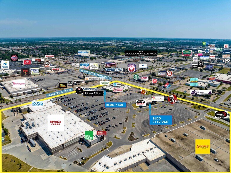 Situé au 71e et au Memorial, Crossing Oaks est un emplacement de vente au détail de choix avec 30 100 DPC (S. Memorial Dr.) et 34 300 DPC (E. 71e St.). La zone commerciale comprend Woodland Hills Mall, Walmart, Burlington, Barnes & Noble, Nordstrom Rack, Old Navy, Ulta, DSW Shoes, Dick's Sporting Goods, Cheesecake Factory, Olive Garden, Red Lobster, IHOP, Starbucks, Target, Sam's et Ollie's Bargain Outlet. Ancré par WinCo Foods, Ross et Sunshine Furniture, le centre dispose actuellement de 2 places disponibles. Joignez-vous à Great Clips, Aspen Dental, H&R Block, AT&T, Take 5, Tommy's Express, Chuck E. Cheese, Jamba Juice, KFC, Wing Stop, City Gear, Ai-Ren Massage, La Reine Nails et Amini's Galleria. Le centre est doté de panneaux de signalisation sur le pylône, d'une intersection avec voie de virage réservée.