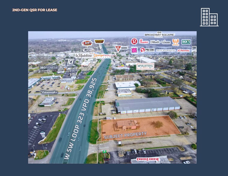 Prime stand-alone restaurant space available at 720 WS W Loop, Tyler, TX 75703—a rare turnkey opportunity in a high-traffic corridor with 38,925 VPD. This space features a spacious kitchen, open dining area, and an existing drive-thru, making it perfect for a quick-service or fast-casual concept. Surrounded by top national restaurant brands and major retailers, the location offers excellent visibility. With its premium positioning and ready-to-go setup, this 2nd generation restaurant space is a rare availability in Tyler.