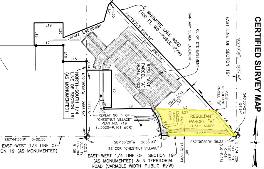 Environ 8 acres à l'angle nord-ouest du Territoire Nord et du chemin Whitmore Lake, juste au nord d'Ann Arbor, dans le canton de Northfield. Juste à l'ouest de la sortie 23/Territoire Nord des États-Unis et à 7 milles porte à porte de l'hôpital de l'Université de M. Égout et eau sur le site. Le plan directeur du canton pour cette zone est à usage mixte commercial/multifamilial et envisagerait de nombreuses utilisations telles que les résidences pour personnes âgées, les soins assistés, la vie autonome, la restauration rapide, le lavage de voitures, etc. Ancré par la nouvelle communauté de Chestnut Hills/Chestnut Village actuellement en construction. 208 Luxury Ranch Apartments 57 maisons unifamiliales. Les images des limites de propriété ont été estimées à des fins d'illustration seulement. Un terrain attenant de 3 acres également mis en vente. Propriété d'un courtier.
