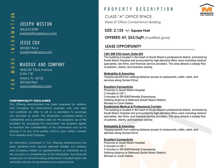 The building is located in the heart of South Miami’s professional district, anchored by South Miami Hospital and surrounded by high-demand office users including medical specialists, law firms, and financial service providers. The area attracts a steady flow of patients, clients, and business activity. Walkability & AmenitiesTenants benefit from walking-distance access to restaurants, cafés, retail, and services along Sunset Drive. Excellent Connectivity Proximity to South Miami Hospital 2 minutes to US-1 3 minutes to SR-826/Palmetto Expressway Walking distance to Metrorail (South Miami Station) Minutes to Coral Gables