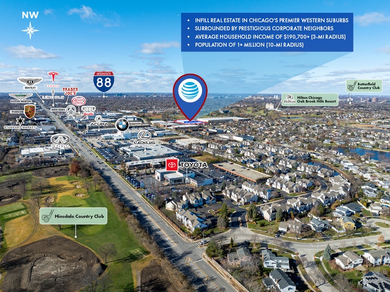 The Property is part of Chicago’s elite Western Suburbs, amid some of the highest-earning most desirable zip codes in the entire United States. Average household income within a 3-mile radius is nearly $200,000, with a population of over 1 million residing in a 10-mile radius. The DuPage County address allows the asset to bene?t from lower taxes and a more business friendly environment compared to neighboring Cook County, while still offering proximity to Chicago’s world class industrial market and infrastructure, just ±17 miles from Downtown. Neighboring tenants include Ferrari, Audi, Mercedes-Benz, Porsche, Butler National Golf Club, and Hinsdale Golf Club, among other prestigious operators.