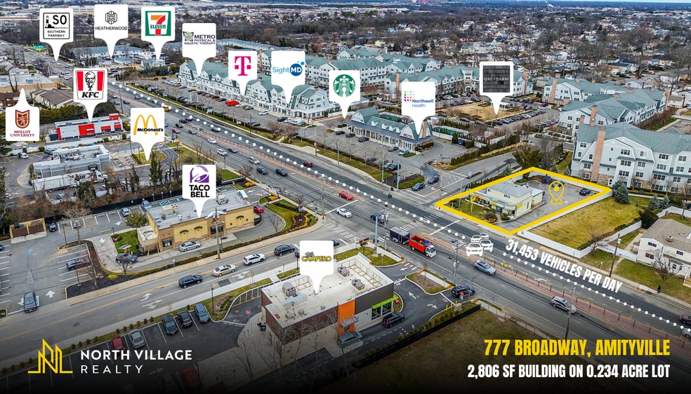 777 Broadway is a high-visibility, 2,806 SF retail building, prominently situated on a strategic corner parcel at the signalized intersection of North Broadway and Cheyenne Trail. This property represents a premier investment or owner/user opportunity directly adjacent to the Greybarn luxury mixed-use development—consisting of 500 residential units and 45,000 SF of prime retail creating an anchor that has completely redefined the local submarket's density. With national quick-service retail brands aggressively developing on nearly every corner of this corridor, the property offers a corner-lot configuration with dedicated on-site parking. Most notably, the building provides the essential utility and high-image presence required for successful retail or service operations seeking to capture the significant consumer traffic and long-term site value of Amityville’s rapidly evolving retail landscape. Contact the exclusive brokers Tom Bigansky and Alex Sobel at 516-830-1703 for the marketing brochure or a private showing.