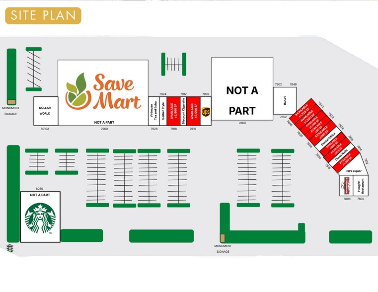 - Grocery-Anchored Center — Save Mart drives daily foot traffic, open 6 AM–10 PM, seven days a week.