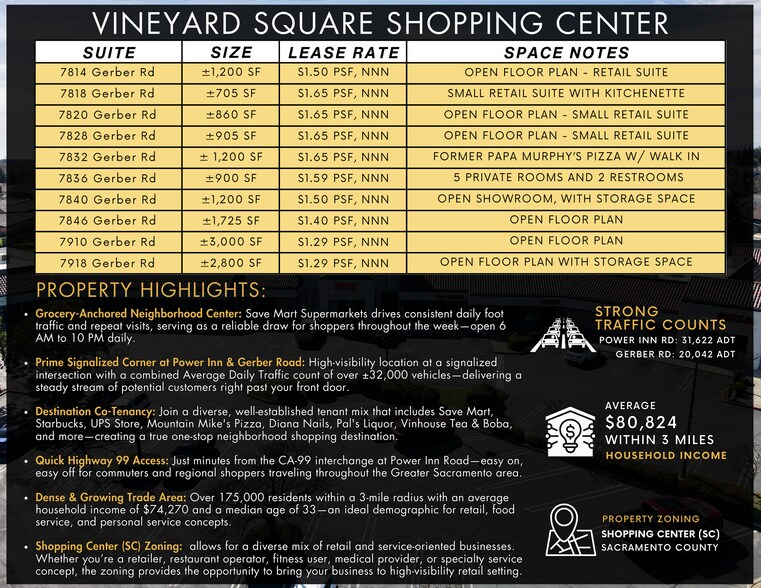 Vineyard Square Shopping Center offers ±705–3,000 SF of retail space along Gerber Road in Sacramento's established Vineyard neighborhood. Anchored by Save Mart Supermarkets, the center sits at the signalized intersection of Power Inn Road and Gerber Road — a high-traffic corner with a combined ±32,000+ vehicles per day. Ten suites are available in a range of sizes and configurations, from small retail spaces with kitchenettes to larger open-floorplan units with storage. Co-tenants include Starbucks, UPS Store, Mountain Mike's Pizza, and Vinhouse Tea & Boba, among others. Highway 99 access is just minutes away via Power Inn Road, connecting the center to commuters and regional shoppers across Greater Sacramento.