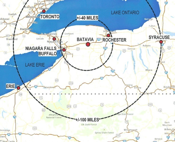 Excellent emplacement entre Buffalo et Rochester, NY. Plus de 2 300 000 millions de personnes à moins de 60 minutes de Batavia. Apportez votre projet au meilleur emplacement du comté de Genesee pour un développement à grande échelle. Zoné et prêt à l'emploi.