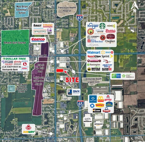 +/- 7,0 acres disponibles pour bail foncier, construction sur mesure ou achat Situé à l'angle dur avec signalisation de l'avenue Emerson et de la promenade Wilson Point d'accès complet partagé au large de la promenade Wilson avec le supermarché Walmart Emplacement à fort trafic avec plus de 27 733 VPH sur l'avenue Emerson La zone commerciale de l'avenue Emerson est ancrée par Walmart Supercenter, Sam's Club, Costco, Kroger Marketplace et plus encore La proximité de l'I-65 (+/- 92 419 VPD) amène les consommateurs d'Indianapolis et de Franklin à cette zone commerciale