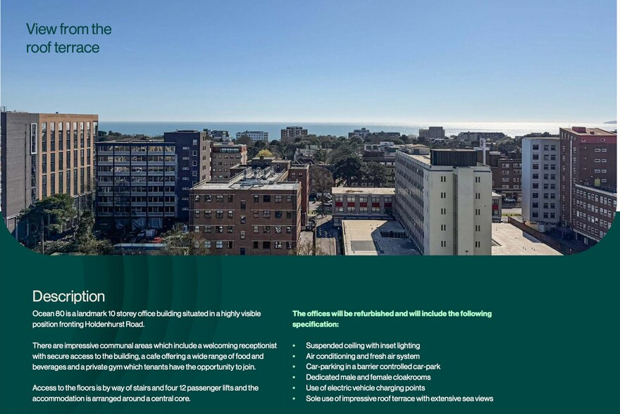 Top floor of one of Bournemouth’s principal office buildings 6,584 sq ft 9 car-parking spaces Impressive roof terrace with extensive sea views Coffee shop with internal and external seating Private members gym on the ground floor Excellent road communications Approximately 750m from Bournemouth’s railway and coach stations Approximately 1.6km from Bournemouth town centre ? VAT currently not applicable