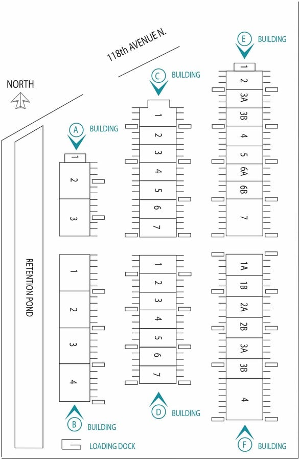 This space is located on 118th Ave just West of Belcher Rd. It has two 10' x 12' roll-up doors, one on each end, as well as a pedestrian door in the front and in the rear. The front pedestrian door opens to a 10' x 12' private office that has a window and door that open into the warehouse. The warehouse is wide-open with a sealed concrete floor, electrical outlets around the perimeter, and skylights that allow for natural light. There is also a mop sink on the outside of a private restroom adjacent to the office. All of our units are constructed of concrete block and covered by an insulated metal roof with a roof ventilator that may be opened to allow heat to escape. This unit also features a central HVAC system and 3-phase power. There is also a common loading dock that may be used by all tenants. Spectrum broadband internet is available.