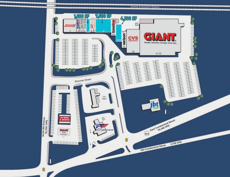 Joignez-vous à GIANT, CVS, Subway, Advance Auto, Gamestop 108 085 +/- sf GLA Locataires de la région : Walmart, Weis, ALDI, Home Depot Situé du côté est du Liban 20 376 rue ADT Old Cumberland et rue Bowman Lat : 76.395581 Longue : 40.343744