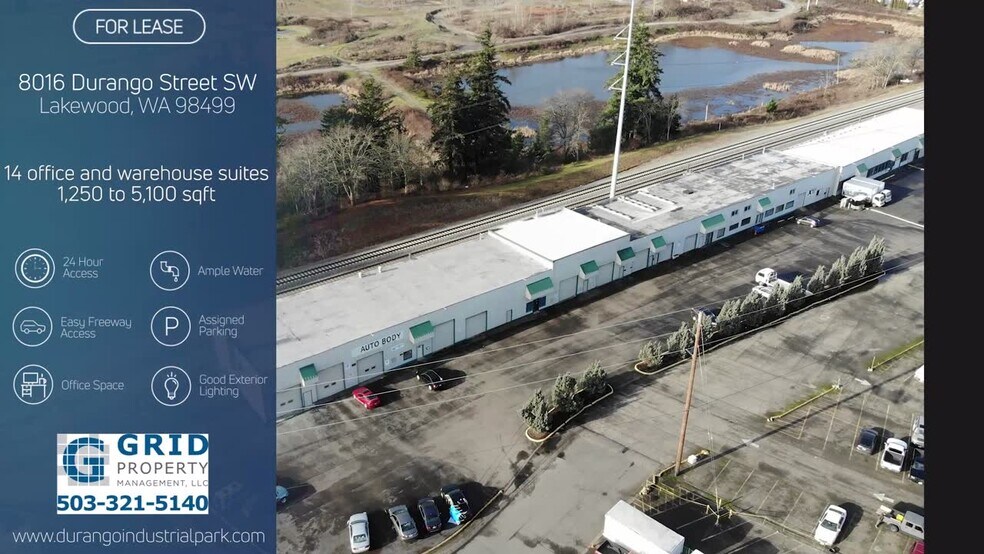 The Durango Industrial Park is located at 8016 Durango Street SW in Lakewood, WA and includes one building comprising approximately 33,160 square feet of leasable space. The industrial park consists of 14 office and warehouse suites ranging in size from 1,250 square feet to 5,100 square feet. Located right off of I-5, the Durango Industrial Park is ideal for businesses that need office, warehouse, storage, or light manufacturing/production space. The Durango building is wood framed with high ceilings and clear spans. The building is fully sprinkled and has ample power and water for your needs. The site has exceptional parking and excellent lighting for security after hours. The Durango Industrial Park underwent a series of site wide renovations including parking lot updates, exterior paint, exterior security cameras, etc! Serious inquiries only. Courtesy to Brokers.