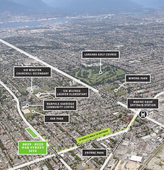 Le site situé au 8029-8225, rue Oak est une occasion de réaménagement résidentiel de premier plan, idéalement situé à quelques pas de la station de train SkyTrain Marine Drive. Doté d'une façade de 600 pieds le long de la rue Oak, il est bien situé au cœur du quartier Marpole de Vancouver-Ouest. Le site est adjacent à la 67e avenue Ouest, une piste cyclable et pédestre populaire reliant le corridor de la rue Granville, la bibliothèque locale, les écoles, les églises et la station Canada Line.