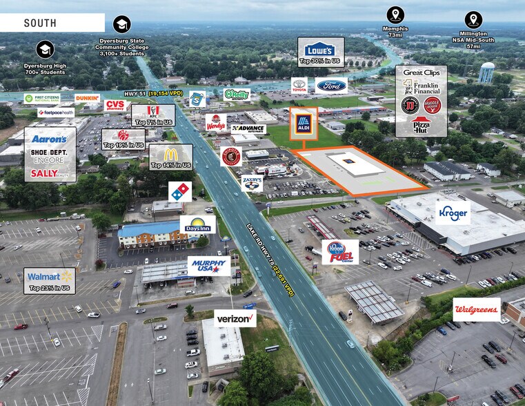ALDI is situated along Lake Road (SR-78) with 22,000+ VPD, less than 0.5 miles from U.S. Hwy 51 and Interstate 155. The property is surrounded by major tenants including Walmart, Kroger, Planet Fitness, Tractor Supply, Chick-fil-A, McDonald’s, Chipotle, Zaxby’s, Lowe’s and The Commons at Dyersburg (Hobby Lobby, Marshalls, Ulta, Five Below), creating a strong retail synergy and consistent consumer traffic.