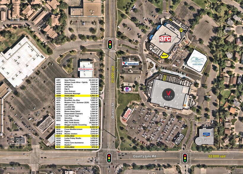 Situé à l'angle nord-est du chemin County Line et de la rue Québec Plus de 54 000 véhicules par jour à l'intersection signalée avec une grande visibilité. À moins d'un mille du centre commercial Park Meadows.