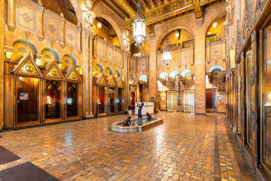 L'Édifice des Beaux-Arts est une structure néo-romane unique et très détaillée conçue par les architectes Albert Raymond Walker et Percy Augustus Eisen en 1927. Ce bâtiment de douze étages comprend un hall de la Renaissance espagnole de deux étages avec une mezzanine en galerie. À l'origine, l'édifice des beaux-arts était destiné à fournir des espaces de travail aux artisans et des expositions en bronze et en verre dans le hall. L'entrée principale présente une arche romane de deux étages ornée de griffons en terre cuite, de gargouilles, d'oiseaux et de fleurs. La façade du bâtiment présente des poissons, des joueurs de flûte, des créatures variées et des figures sculptées. En 1983, le bâtiment a été restauré et rénové par le promoteur Ratkovich et Bowers et l'architecte Brenda Levin.