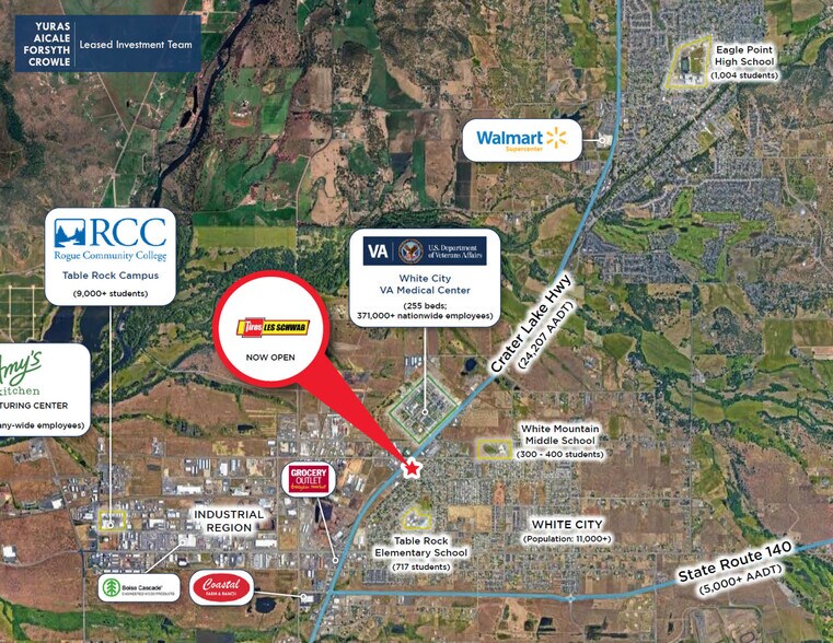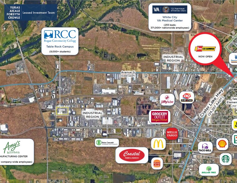 High-visibility location near the signalized four-way intersection of Crater Lake Highway and Avenue G, allowing for excellent accessibility. Corporately guaranteed by LS Group Parent OpCo, LLC, strengthening investment security. The five-mile radius serves a populous region of 33,072, with an average annual household income of $97,040. Property features a beneficial proximity to Interstate 5, greatly increasing accessibility to both local and commuter traffic (38,430 AADT). Absolute NNN ground lease structure transfers maintenance and expense obligations to tenant, including roof, structure, and parking lot. Projected population and income increases within 1-, 3-, and 5-mile radii over the next five years poise this Les Schwab and White City for steady concurrent growth.