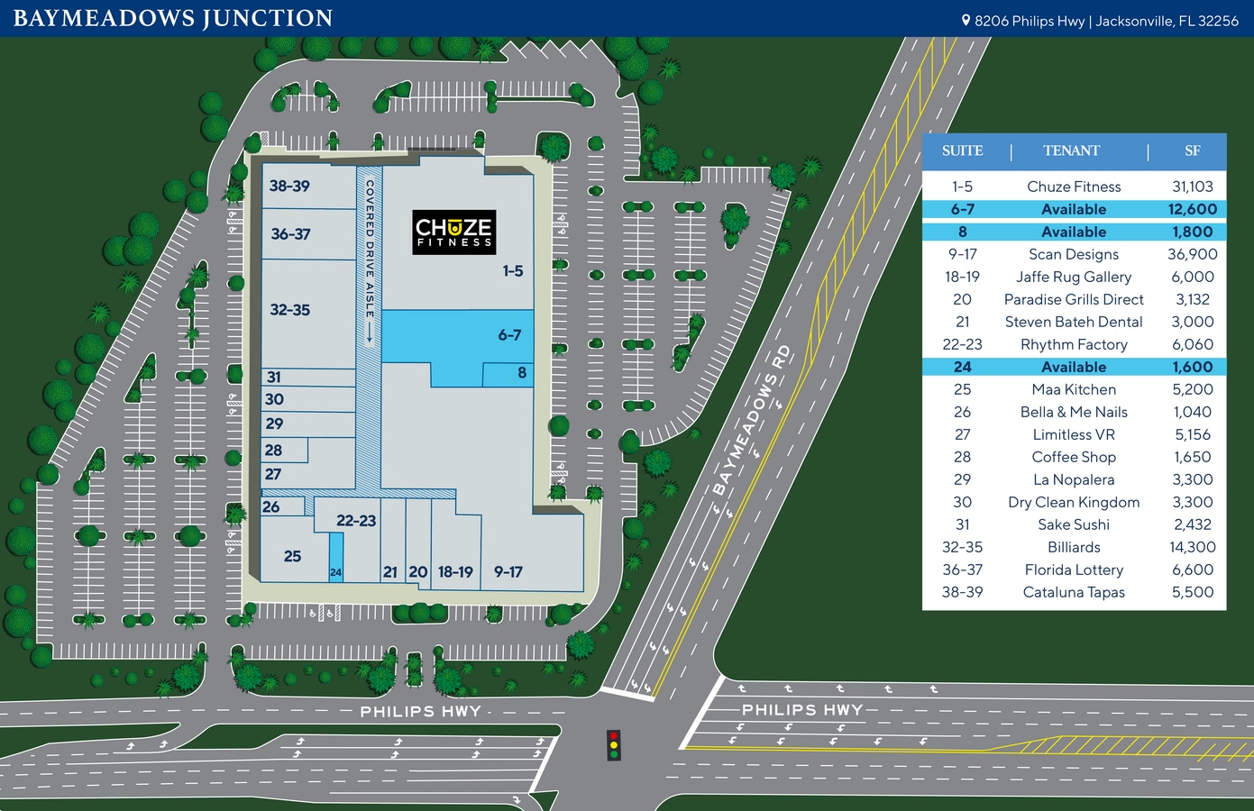 Baymeadows Junction est un centre commercial communautaire de 150 665 pieds carrés situé dans le quartier très fréquenté de Southside. Idéalement situé à l'intersection de la Philips Highway et de Baymeadows Road, ce centre bénéficie de la proximité de divers parcs d'affaires et fournisseurs de services aux consommateurs, ce qui en fait une destination de choix pour les acheteurs. Avec le potentiel d'attirer plus de 70 000 automobilistes chaque jour, Baymeadows Junction offre une visibilité et une accessibilité importantes. De plus, une parcelle extérieure est disponible sur place, capable d'accueillir un bâtiment d'une superficie maximale de 5 200 pieds carrés, ce qui offre d'autres possibilités d'agrandissement.