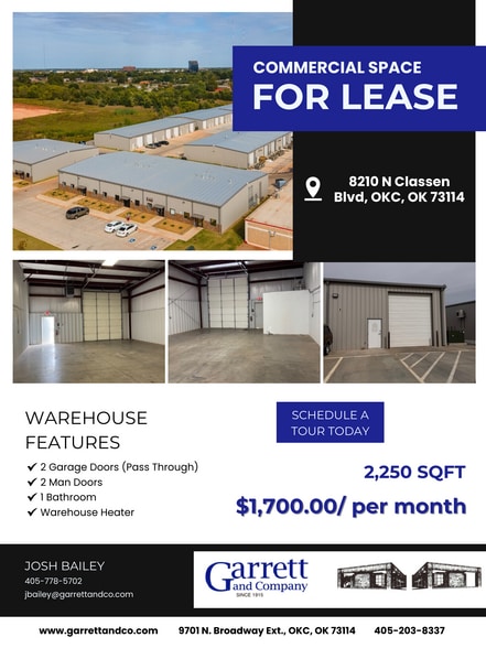 LARGE COMMERCIAL WAREHOUSE / GARAGE / AVAILABLE FOR LEASE/ RENT- OKC / OKLAHOMA CITY Address: 8210 N. Classen Blvd, Oklahoma City, OK 73114 Price: $1,700.00/ per month Warehouse Features: 2,250 Sqft 2 Garage Doors (Pass Through) 2 Man Doors 1 Bathroom Warehouse Heater For more details or to view this unit please contact us at: Garrett and Company, LLC at our office (405) 840-3371 OR Joshua Bailey at (405) 778-5702 (Call or Text) Email: jbailey@garrettandco.com